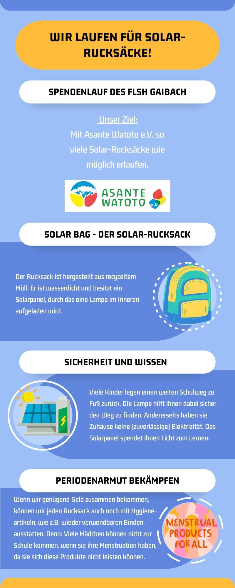 Die Hälfte dieser Summe kommt dem Frankenlandschulheim bzw. seinen vielfältigen Aktionen selbst zugute, mit der anderen Hälfte – und jetzt wird’s spannend – werden Solarrucksäcke („Somabags“) für unsere Ndoto zetus finanziert. Ist das nicht wundervoll?